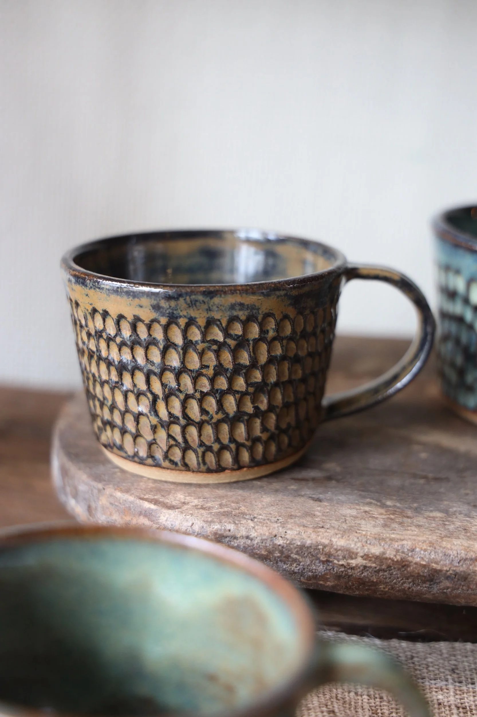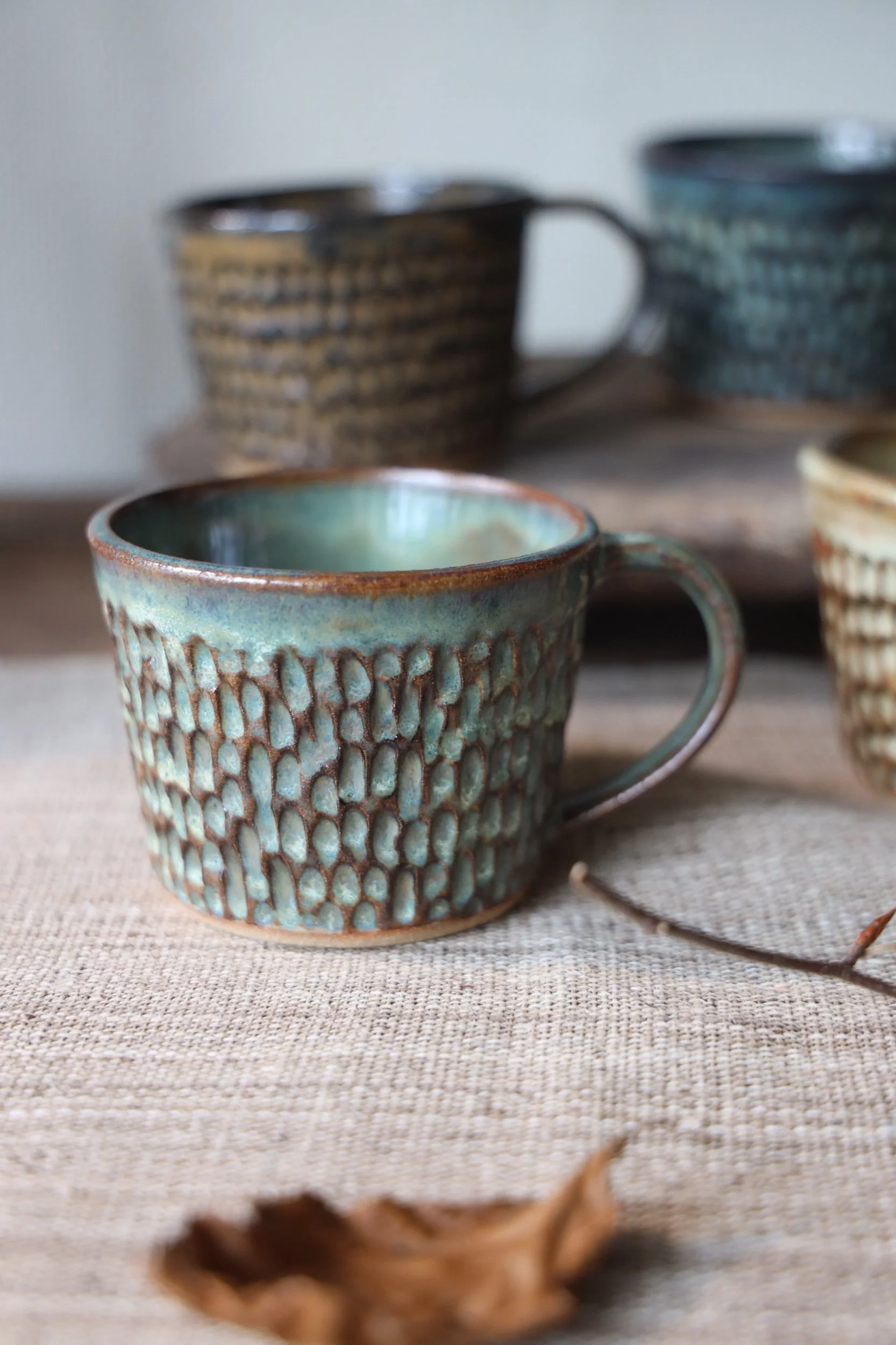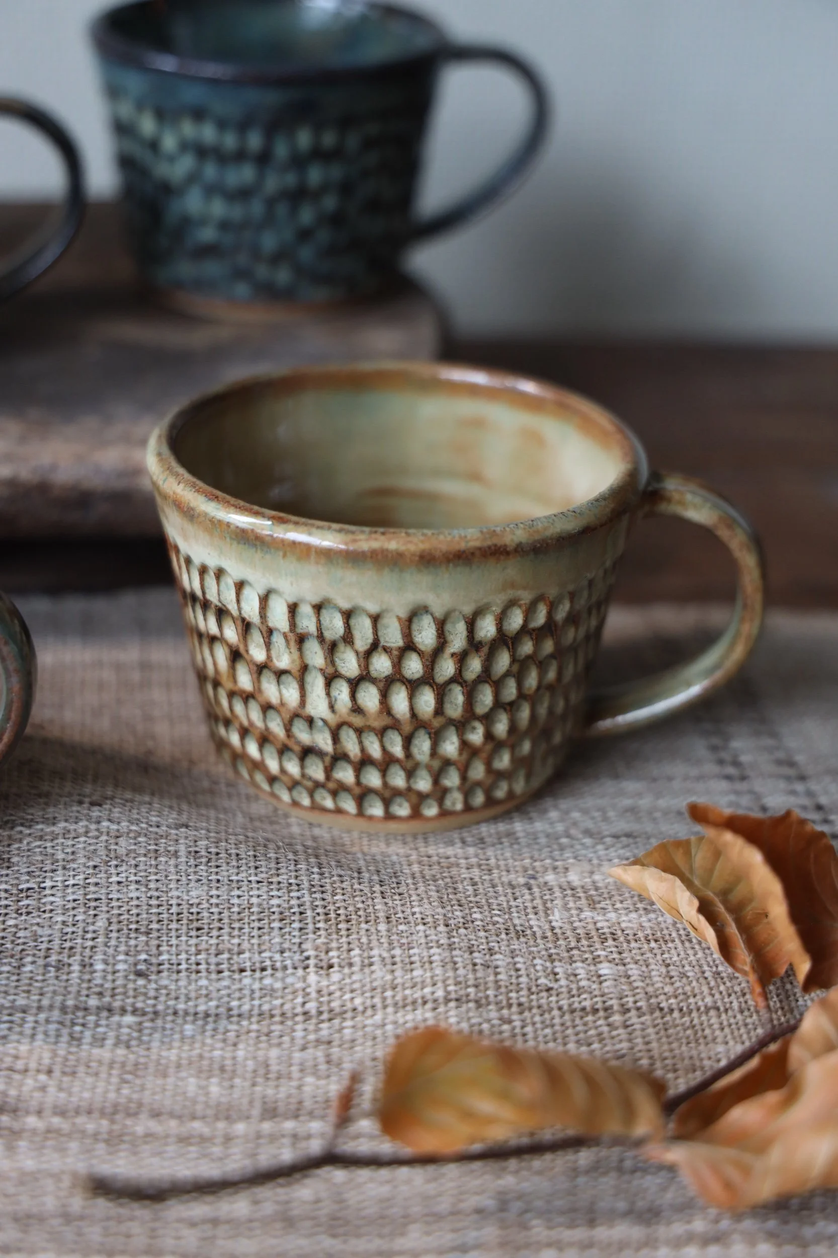 Beautiful ceramic coffee mugs by Polly Howard handmade in Cornwall with dappled texture and choose from four different glaze colours.
