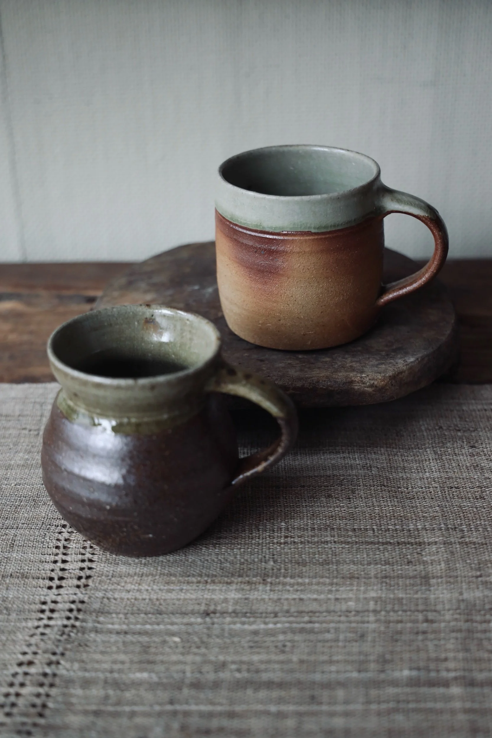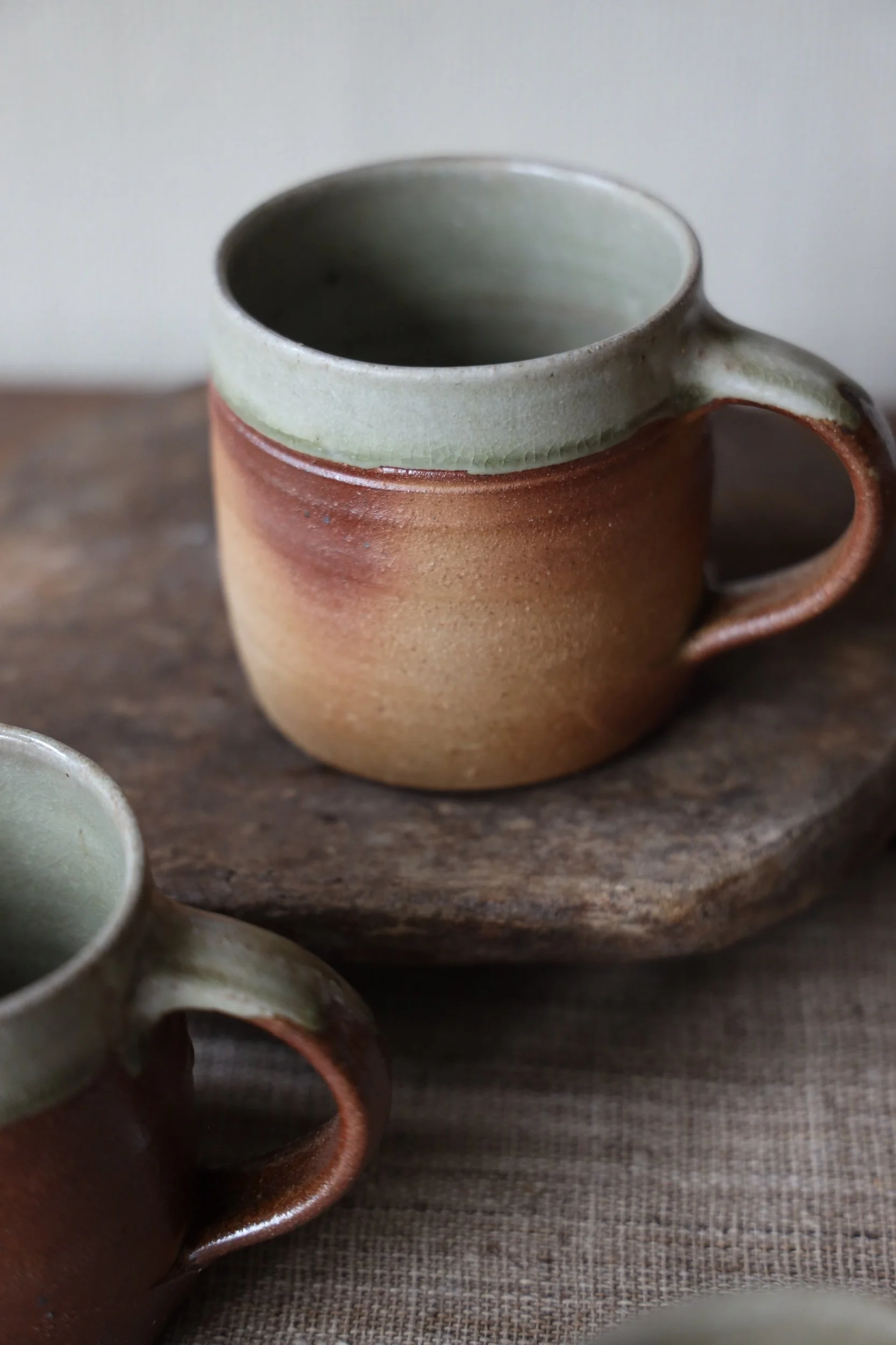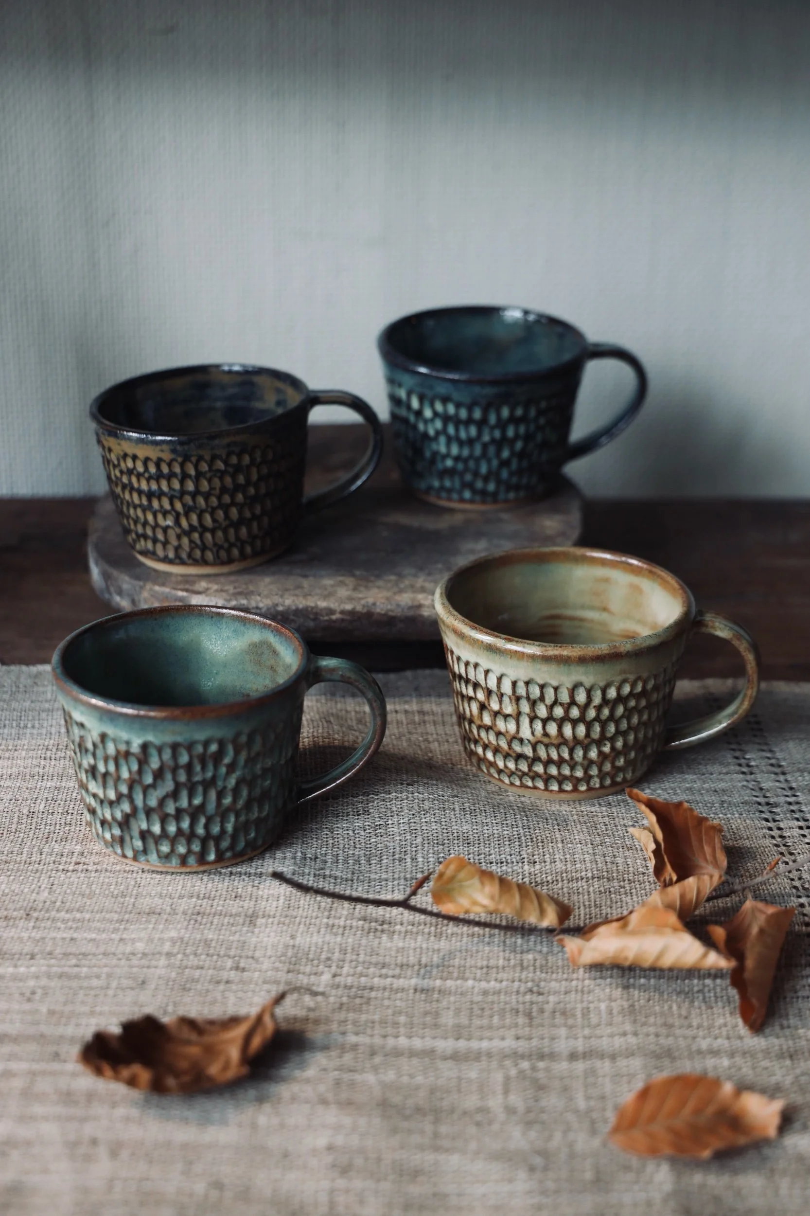 Beautiful ceramic coffee mugs by Polly Howard handmade in Cornwall with dappled texture and choose from four different glaze colours.